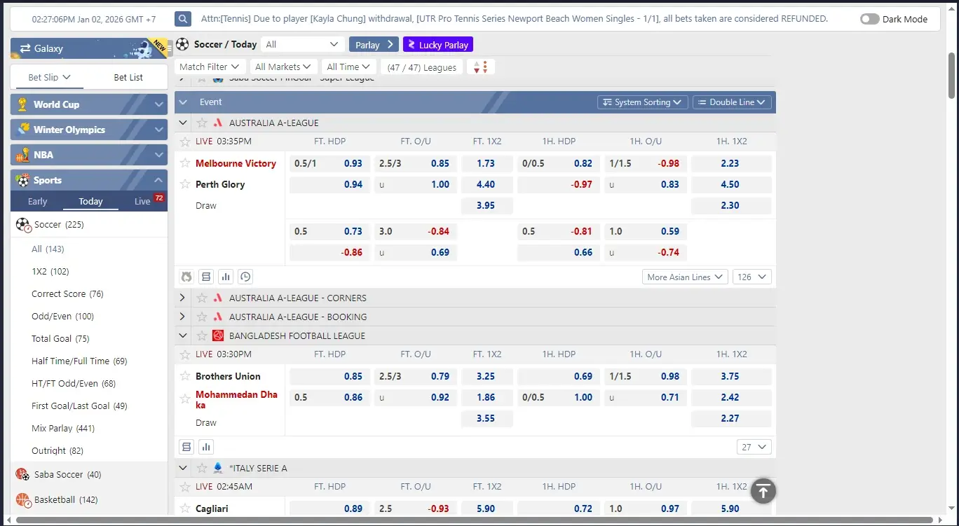 Advanced Asian Handicap (HDP): SABA provides refined “quarter-point” lines, giving more control to the bettor.
